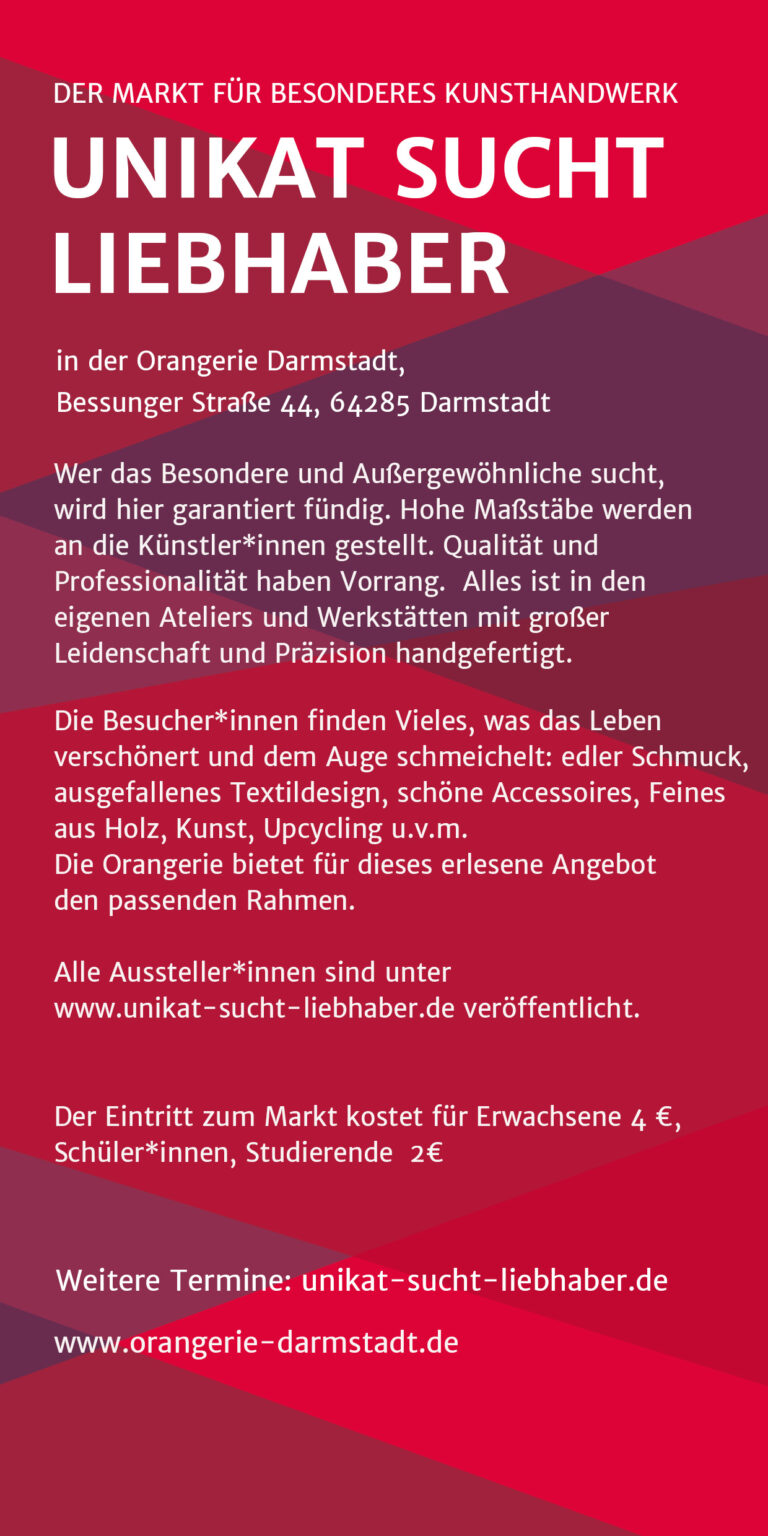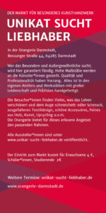 Am 18. + 19.10. lädt die Orangerie in Darmstadt von 11 – 18 Uhr unter dem Motto „Unikat sucht Liebhaber“ zum
